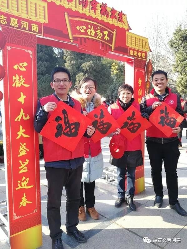 多名書法愛好者現(xiàn)場揮毫潑墨,為群眾書寫春聯(lián)。“心凝十九大盛世迎春、夢圓雙百年中原出彩”、“百世歲月當(dāng)代好,千古江山今朝新”……在志愿者們的筆下,一幅幅寄托著對新春美好祝福的對聯(lián)躍然紙上。前來領(lǐng)“?!弊帧⒋郝?lián)的群眾絡(luò)繹不絕,紛紛挑選自己喜歡的內(nèi)容,請志愿者現(xiàn)場書寫。紅火的對聯(lián)、喜慶的福字、精美的年畫、燦爛的笑容……志愿者們忙的不亦樂乎,活動現(xiàn)場歡聲笑語不斷,為即將到來的新春佳節(jié)增添了濃濃的喜慶氛圍。